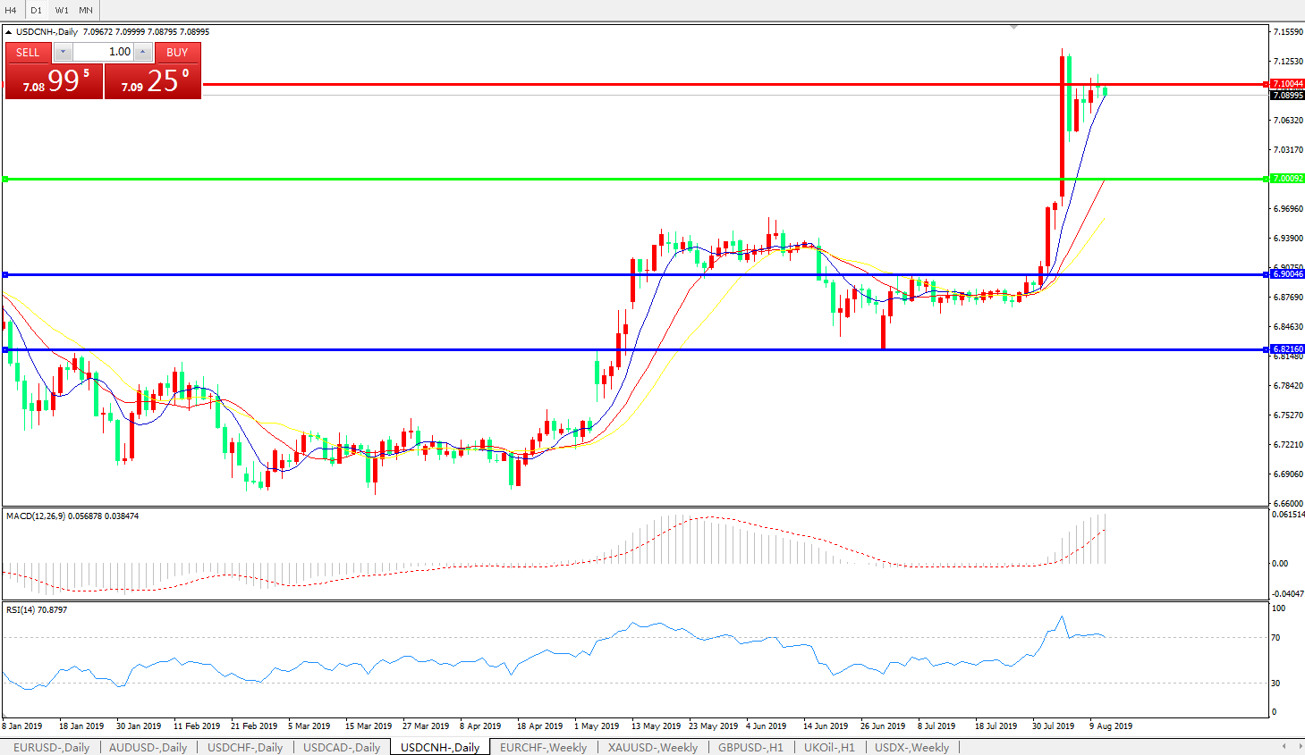 备选策略: 在7.0000之下,看跌,目标价位为6.9010,然后为6.8210。