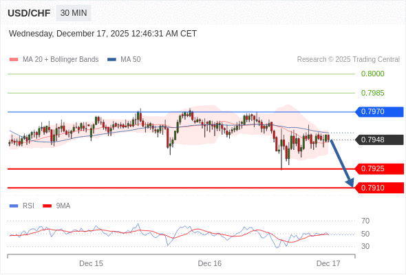 在 0.7970 之下,看跌,目标价位为 0.7925 ,然后为 0.7910 。