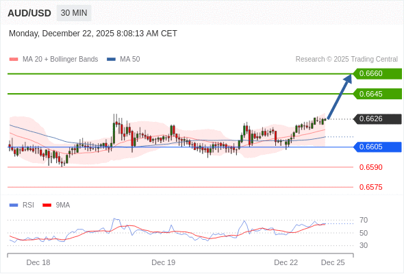 在 0.6605 之上,看涨,目标价位为 0.6645 ,然后为 0.6660 。