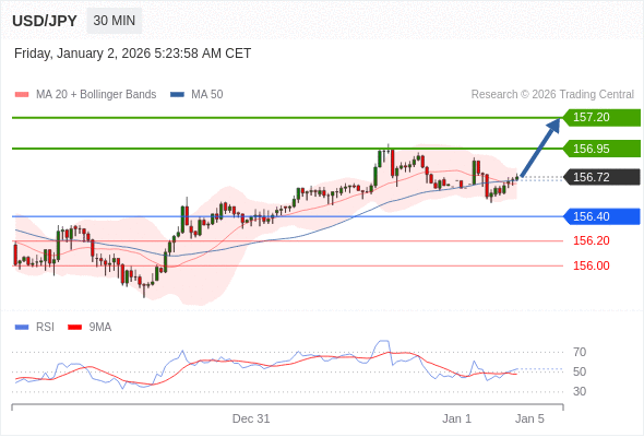 在 156.40 之上,看涨,目标价位为 156.95 ,然后为 157.20 。