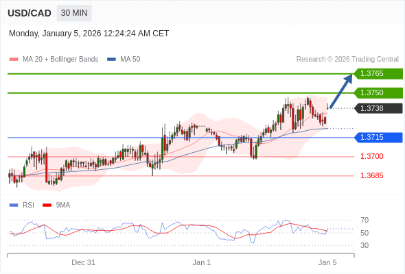 在 1.3715 之上,看涨,目标价位为 1.3750 ,然后为 1.3765 。