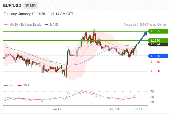 在 1.1655 之上,看涨,目标价位为 1.1680 ,然后为 1.1695 。