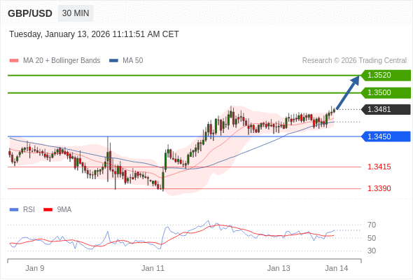 在 1.3450 之上,看涨,目标价位为 1.3500 ,然后为 1.3520 。