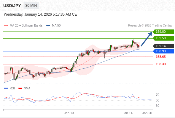 在 158.90 之上,看涨,目标价位为 159.50 ,然后为 159.80 。