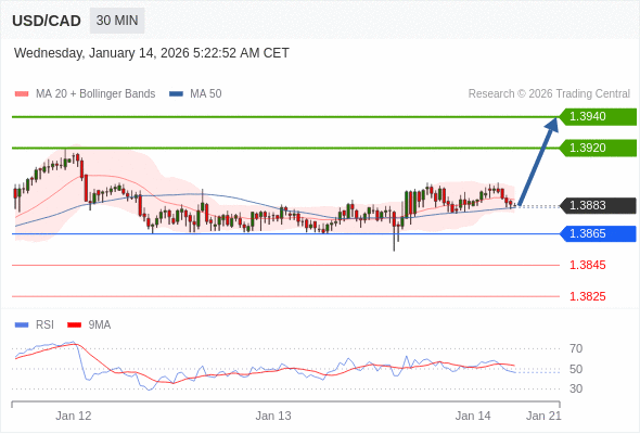 在 1.3865 之上,看涨,目标价位为 1.3920 ,然后为 1.3940 。