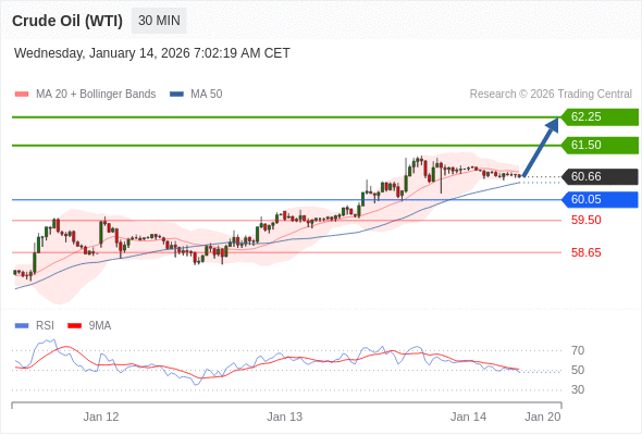 在 60.05 之上,看涨,目标价位为 61.50 ,然后为 62.25 。