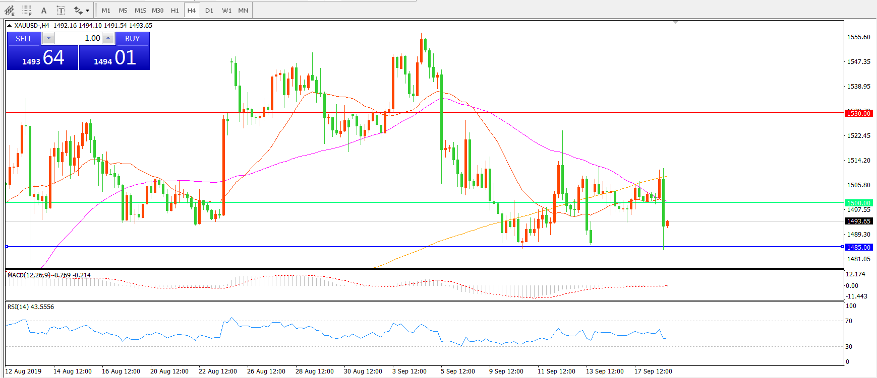 交易策略:在1500.00之下看跌,目标1485.00 1450.00