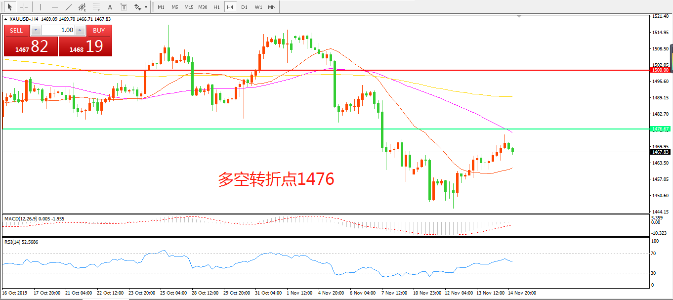 4小时图看,金价延续震荡反弹,短期走势有所回暖,1500美金成为短期重要关口,均线系统逐渐走平,MACD绿柱减少,RSI指标走平,日内重点关注1475附近得失。
