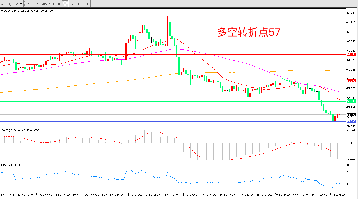 4小时图看,油价阴线连续下破,触碰下方55附近支撑后小幅回升,整体表现低迷,均线系统拐头向下,MACD绿柱增加,RSI指标走平,日内震荡下行概率较大。