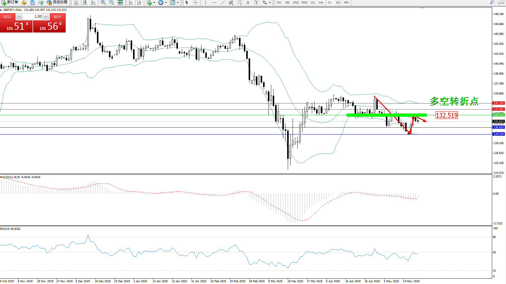 交易策略:132.519下方看跌,目标130.610129.539