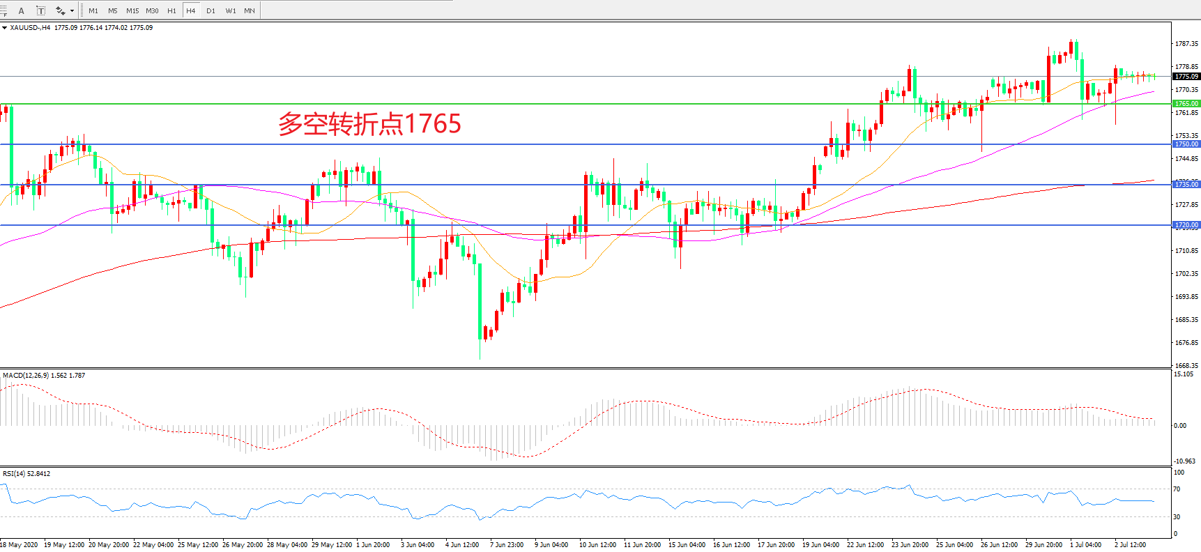 交易策略:在1765.00之上看涨,目标1780.00   1800.00