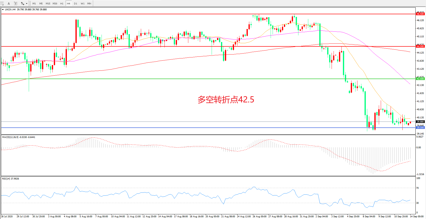 交易策略: 在42.50之下看跌,目标39.50 37.00