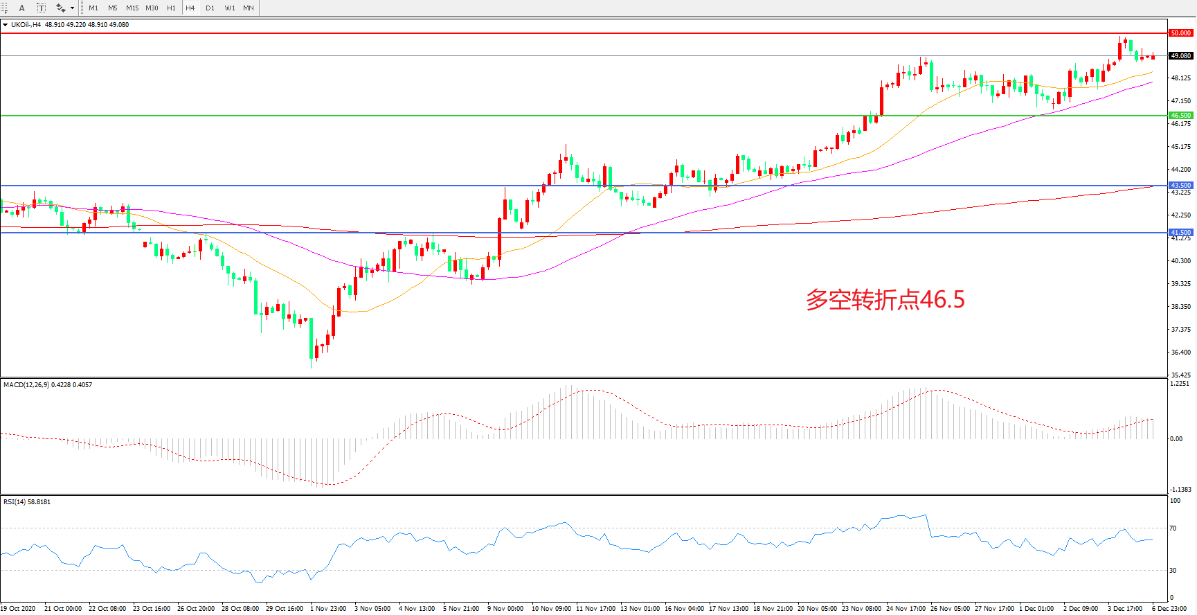 4小时图看,油价延续高位震荡,整体表现相对强势,55周期均线成为短期支撑,50美元成为中期阻力,MACD红柱减少,RSI指标走平,日内延续震荡概率较大。