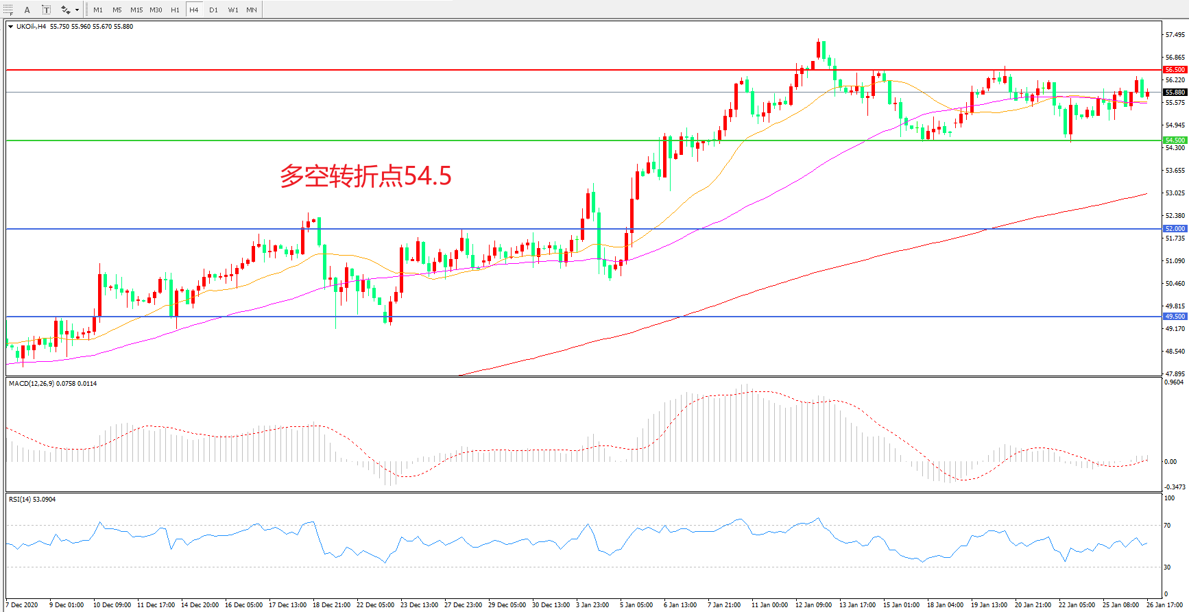 交易策略:  在54.50之上看涨,目标56.50    60.00