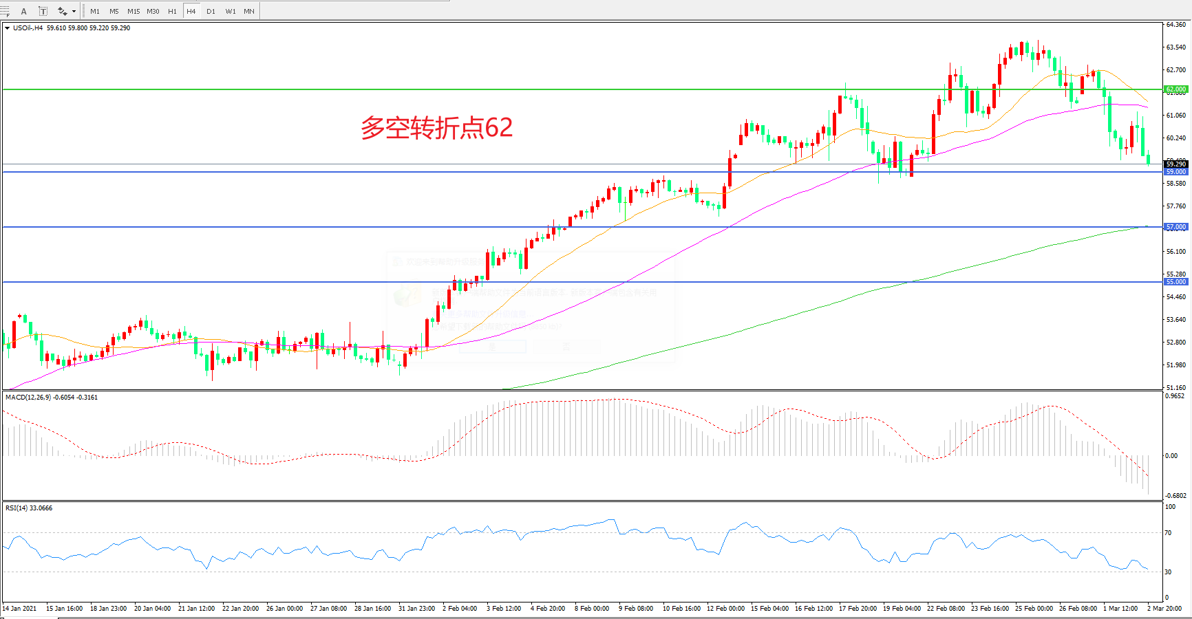 4小时图看,油价长阴下破,上行趋势遭到破坏,短期均线拐头向下,62美元成为上方阻力, MACD绿柱增加,RSI指标走平,日内震荡下行概率较大。