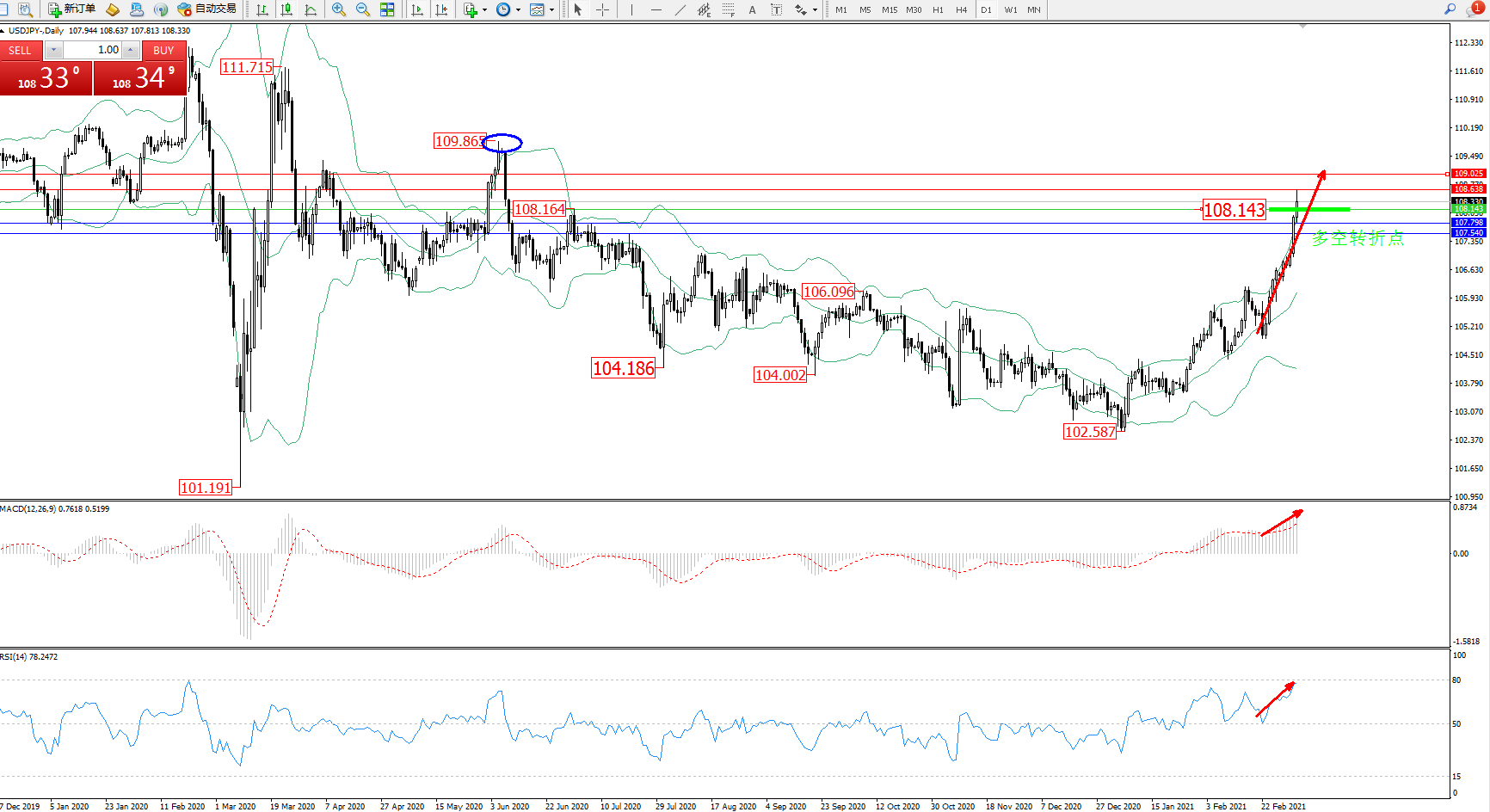 技术点评:多头动力延续布林带指标上轨附近节点持续震荡上扬态势良好,且多头动力未见止步迹象,前期高位109.865附近节点近在咫尺破位在即,布林带指标呈张口走势持续中,MACD指标处于多头区域维持整理平缓向上移动态势良好,RSI指标处于多头区域持续震荡上移即将触及超买区80均衡线附近节点;