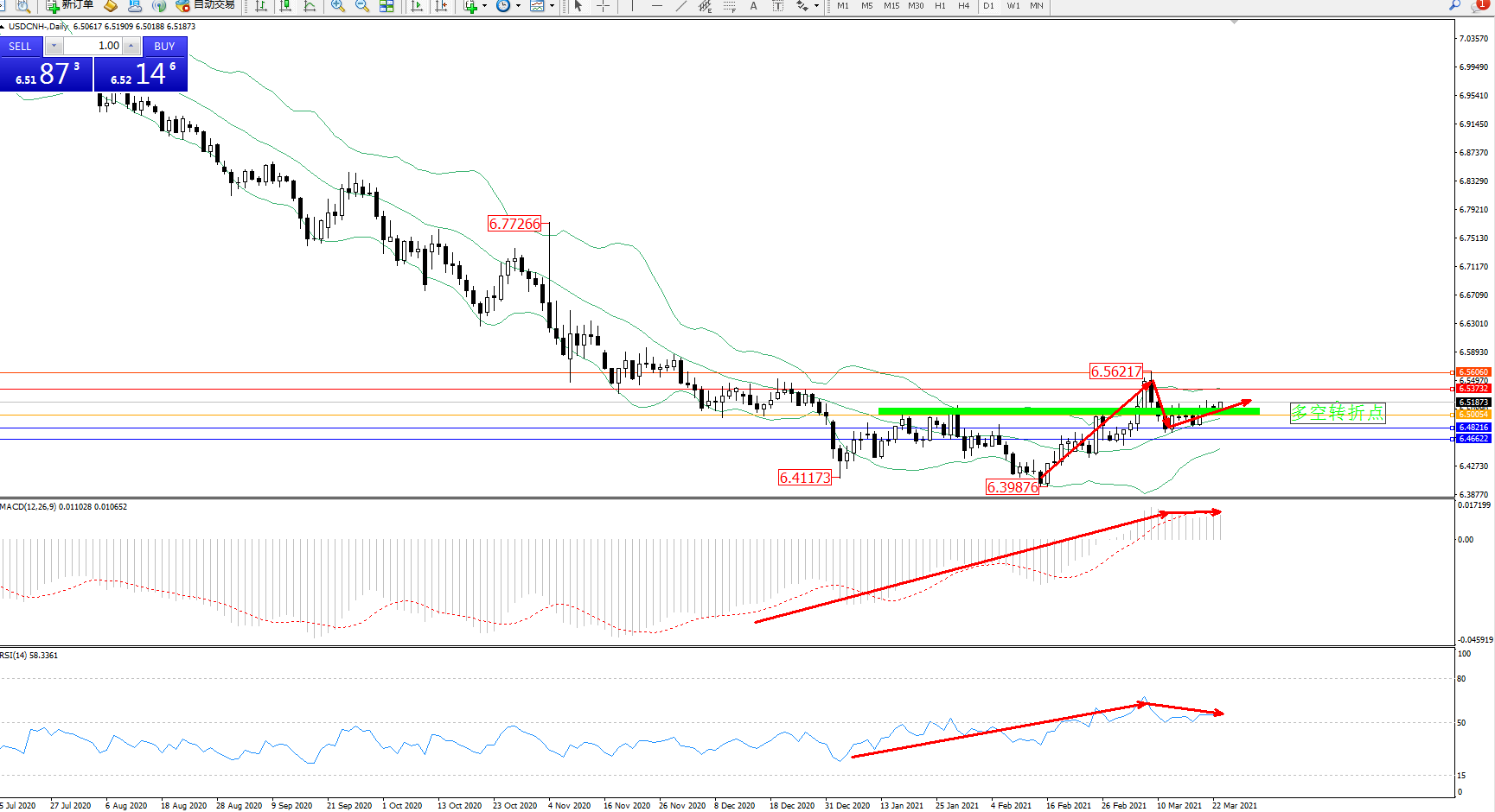 美元人民币USDCNH——日K线图显示: