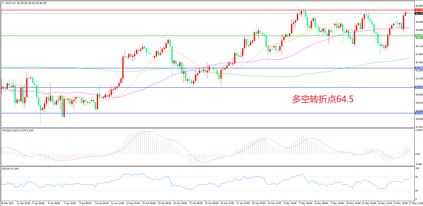 交易策略:在64.50之上看涨,目标66.50 69.00
