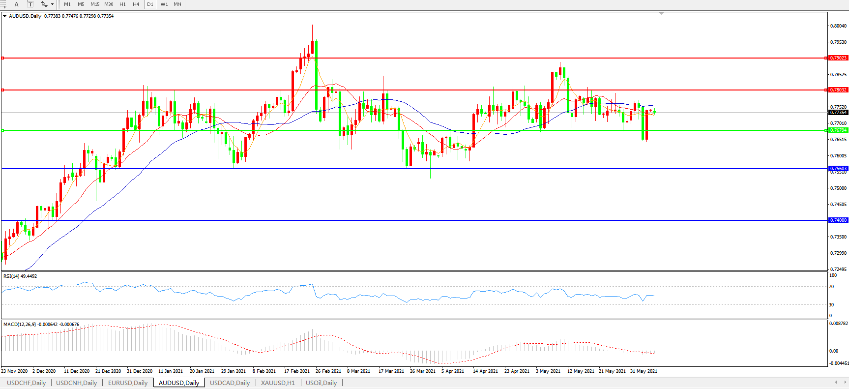备选策略:0.7680下方看跌,目标0.7560、0.7400