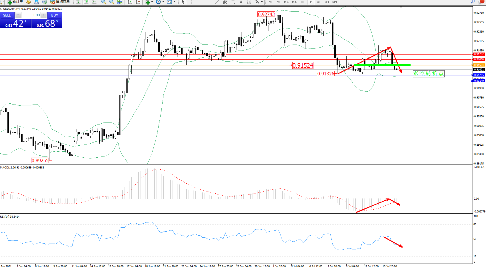 备选策略:0.91524上方看涨,目标0.91660、0.91782