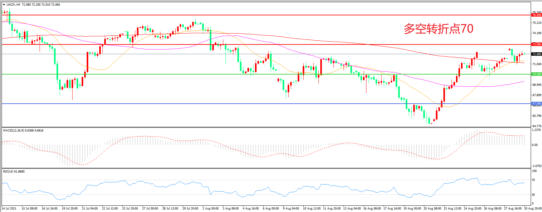 4小时图看,油价突破70美元后延续窄幅震荡,整体表现偏强, 200周期均线被顺利突破,MACD红柱增加,RSI指标走平,日内震荡上行概率较大。