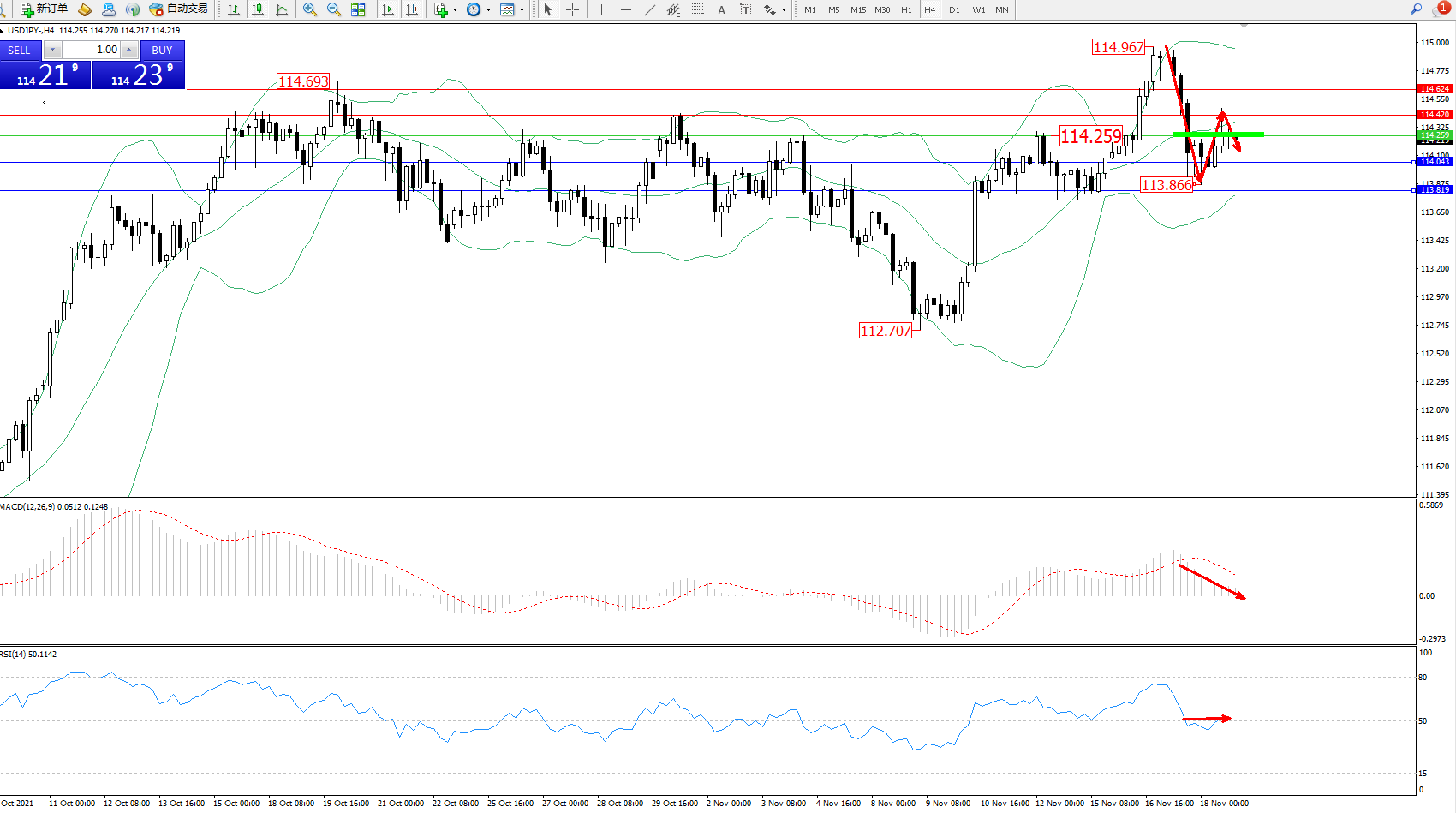 交易策略:114.259下方看跌,目标114.043、113.819