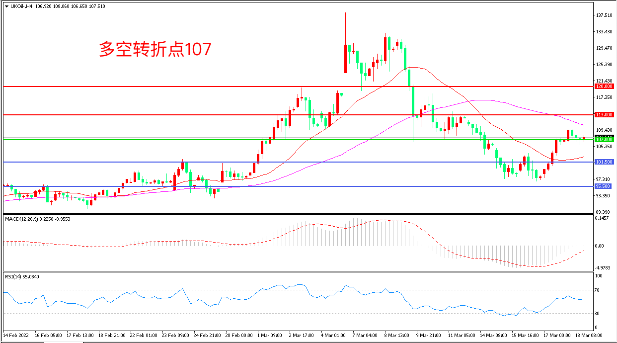 4小时图看,油价突破107美元后区间震荡形态明显,均线系统走平,MACD绿柱缩短,RSI指标走平,日内震荡上行概率较大。