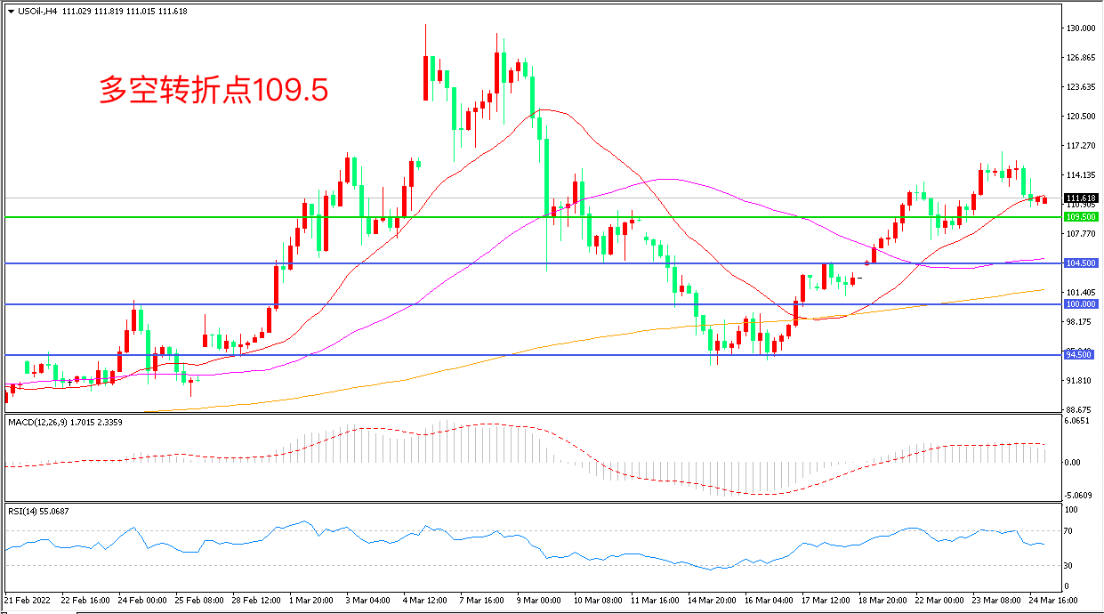 周四(3月24日)美国能源部长和国际能源署IEA在联合记者会上表示,准备好在必要时释放更多战略石油储备,美国WTI原油受到打击,小幅下挫后收报111.64美元/桶。3月首周IEA宣布释放的6000万桶原油库存,仅占IEA成员国储备的4%,即还有空间释放更多,但俄乌局势陷入僵局的形势下,油价仍然易涨难跌。