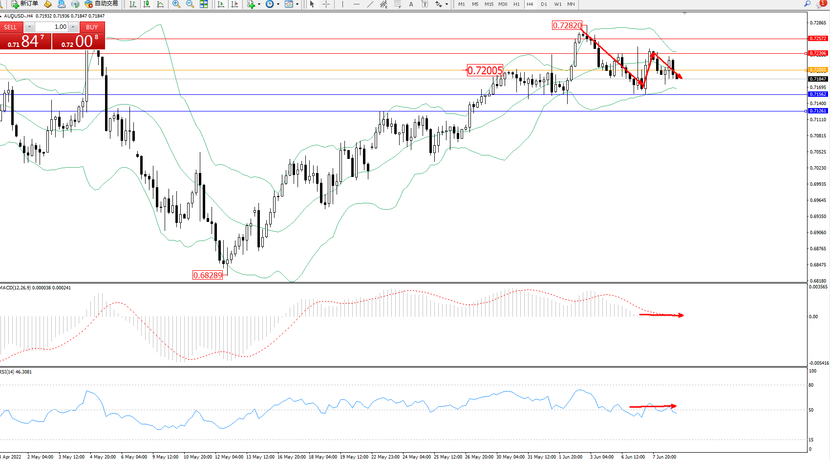 交易策略:0.72005下方看跌,目标0.71562、0.71261