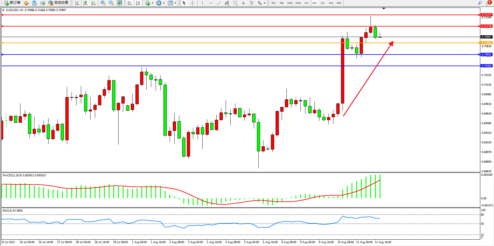 交易策略:0.70886上方看涨,目标0.71178、0.71377