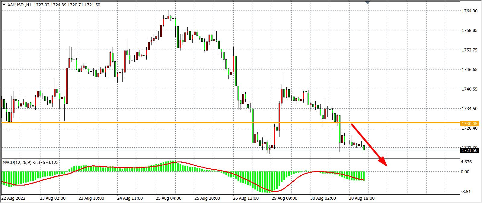 1小时图看,金价再度跌破1730美元,趋势回归空头,MACD于零轴之下重新放量,显示下降趋势有所延续,日内在1730之下继续看跌,目标1700-1680。