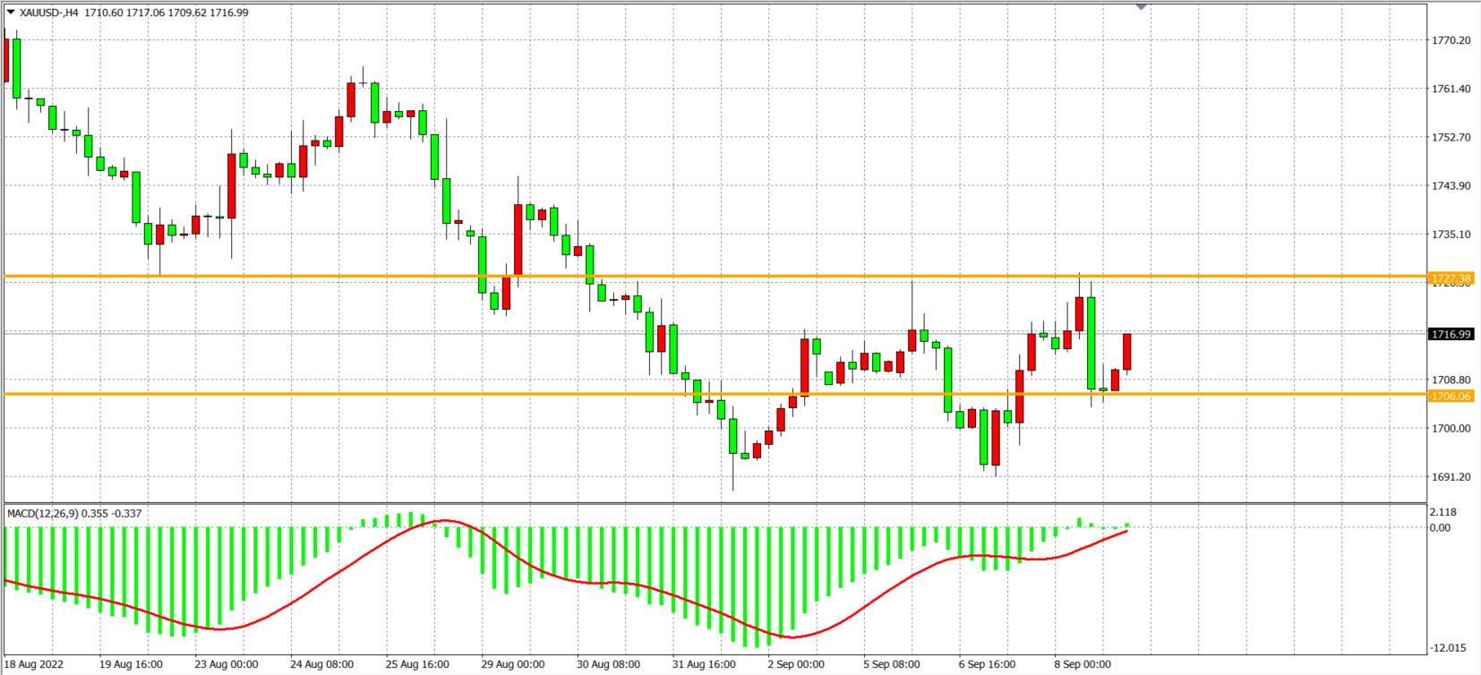 周四(9月8日)欧央行如市场所预期,首次加息75个基点,随后拉加德鹰派发言继续令美指走低失守110关口,但另一方方面初请失业金人数乐观,突显了美国就业市场的强劲势头,美债收益率重登高位,现货黄金先涨后跌,回到1710美元关口下方,最终收涨跌0.53%。