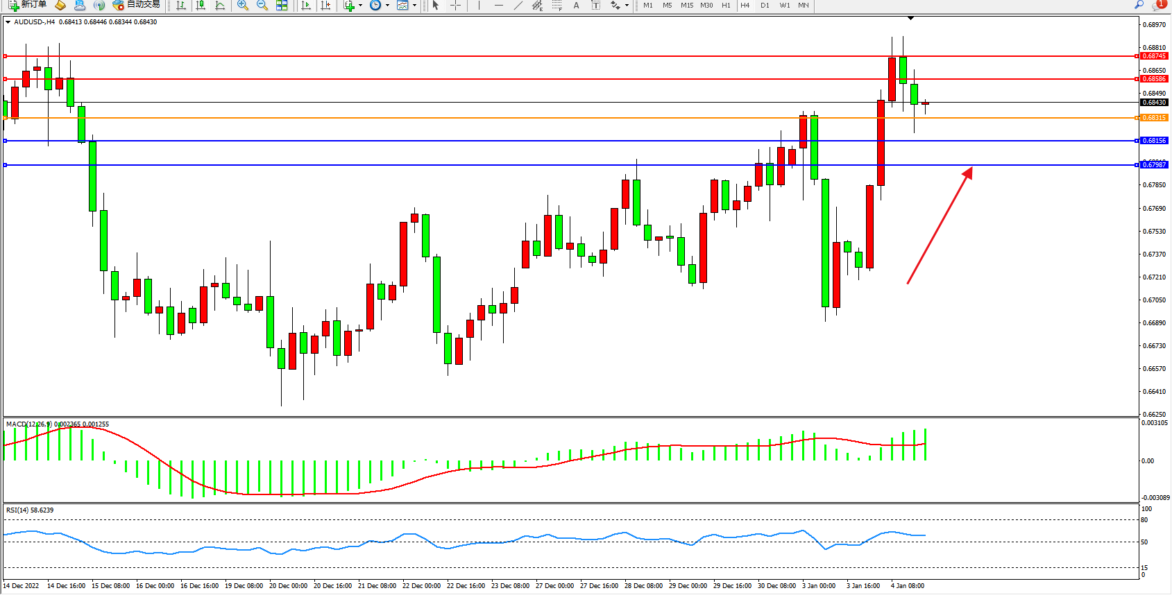 交易策略:0.68315上方看涨,目标0.68586、0.68745