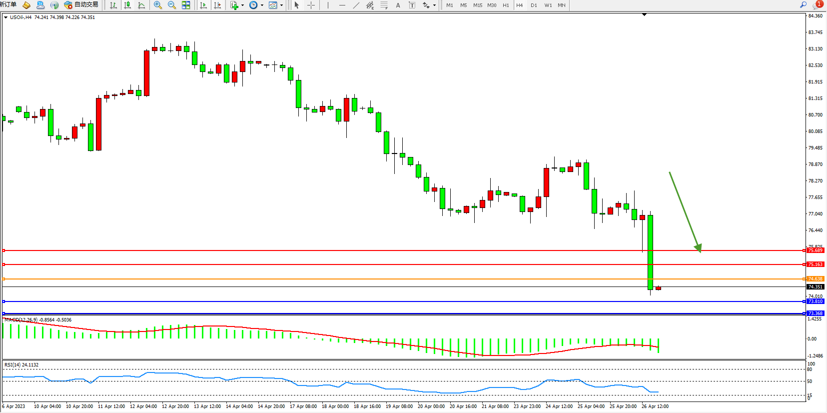 交易策略:74.638下方看跌,目标73.810  73.368