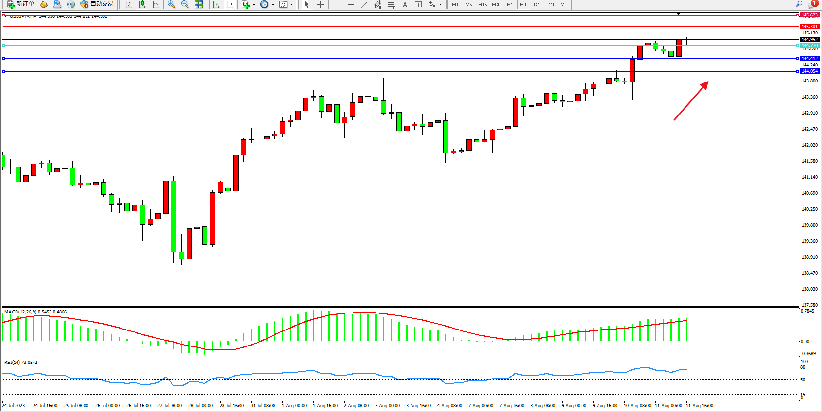 备选策略:144.770下方看跌,目标144.412 144.054