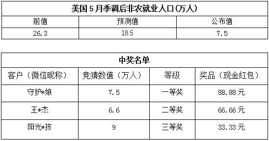 5月份非农就业人数大竞猜活动中奖结果已出,获奖信息如下: