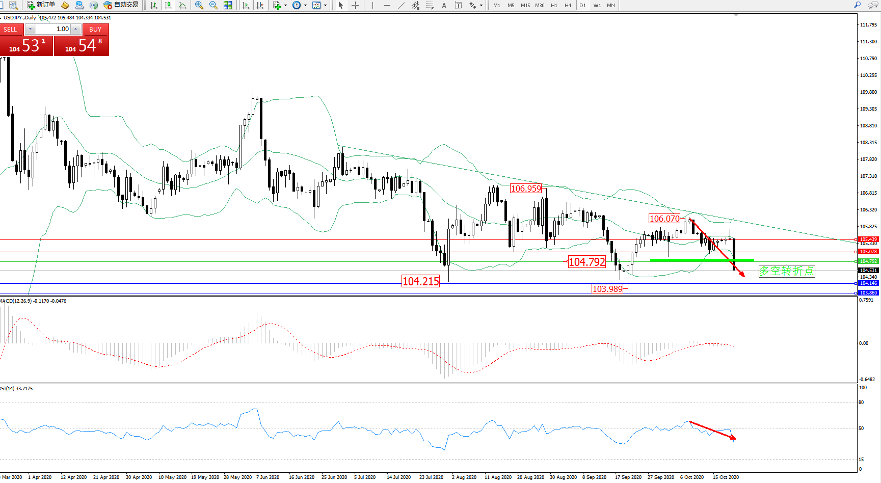 技术点评:长时间处于布林带指标中下轨区间弱势整理后,空头动力急速下挫,跌破布林带指标下轨附近后有进一步下挫态势,前期低位103.989位置近在咫尺破位在即,布林带指标呈收口走势后开始张口迹象,MACD指标处于0轴线下侧弱势徘徊中,RSI指标处于50均衡线下侧弱势徘徊后强势下挫中;