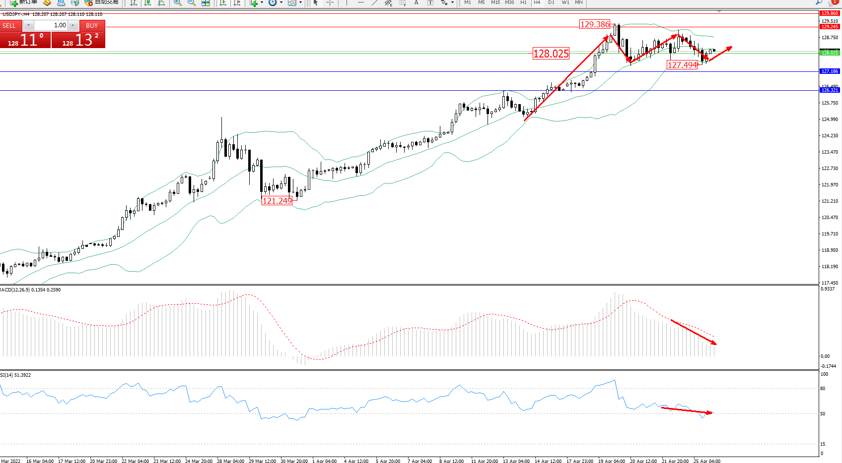交易策略:128.025上方看涨,目标129.245、129.860