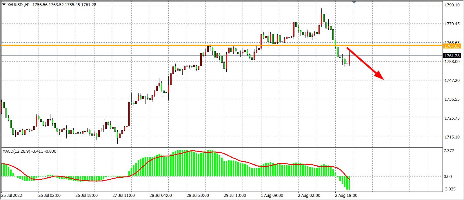 1小时图看,金价冲高回落跌破支撑1767,目前支撑转化为阻力,短期走势料将围绕该位形成拉锯战,MACD于零轴之下放量,预示行情或进一步走低,日内在1767之下看跌,下方目标1750-1736
