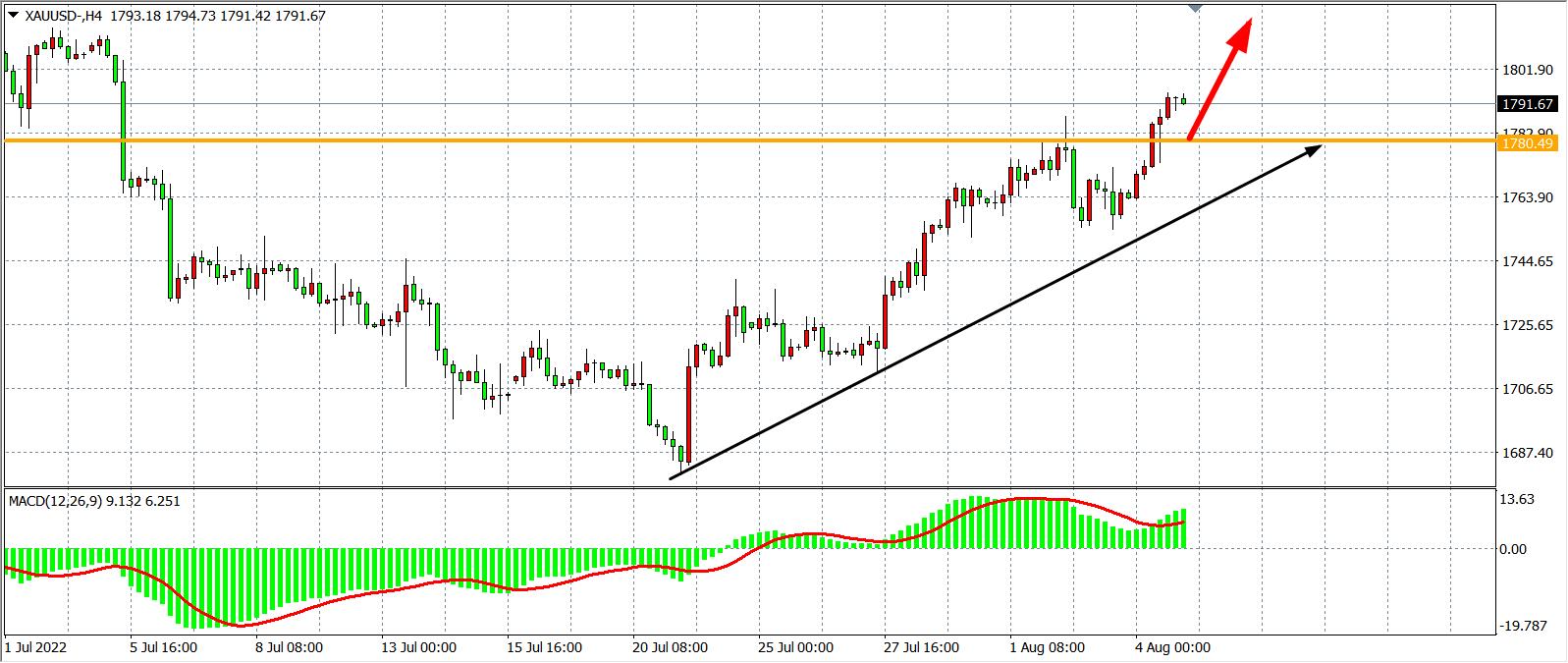 4小时图看,金价延续涨势,再度突破前高点区域,目前阻力位1780已转化未支撑,MACD于零轴之上继续放量,预示行情或有进一步走高动能,日内在1780之上继续看涨,上方目标1800-1820