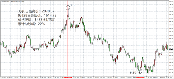 黄金表现:从3月1日开始,黄金从2070点一路下跌至9月28日的1614点, 价格波动:455.64 美元,累计总跌幅%:22%。