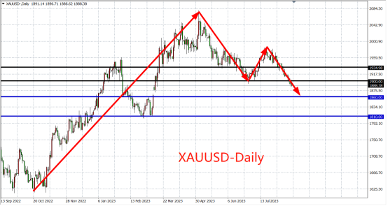 黄金日线图,金价延续下降趋势,多空分水岭位于1900关口,若重返该位则上方看至1930-1950附近,若延续该位之下则继续下看前一波底部区域1860-1810附近。